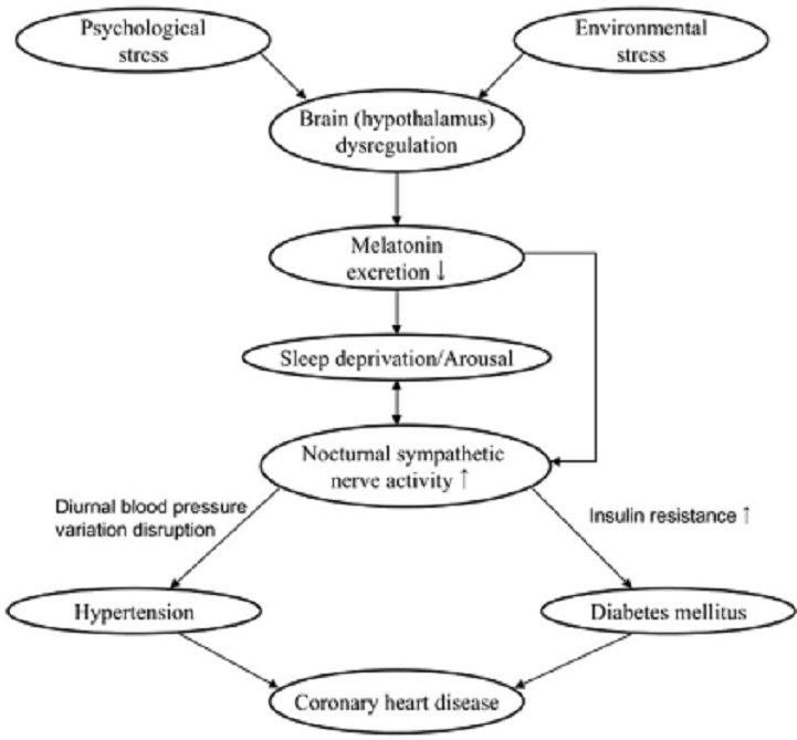 There is a widespread phenomenon of insufficient sleep in developed countries. People typically sleep for an average of just 6.8 hours per night, 1.5 hours less than a century ago. In the past, the impact of sleep deprivation on our bodies was not well understood. However, recent research has shown that sleep deprivation is linked to hypertension (high blood pressure), coronary heart disease (CHD), and diabetes mellitus (DM). The chart below details the relationships between sleep deprivation and hypertension, diabetes mellitus, and coronary heart disease.